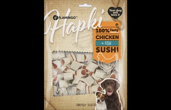 Lekker tussendoortje voor je viervoeter met kip en vis. Deze sushi snack is laag in vetgehalte, bevat geen toegevoegde suikers en is glutenvrij. De snacks hebben een hoog proteïne gehalte wat bijdraagt tot een goede spieropbouw