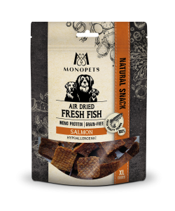 Monopets air dried snacks Fresh Fish Salmon Cubes XL is een smaakvolle snack op basis van één dierlijke eiwitbron. Deze graanvrije en hypoallergene snack van zalm is een natuurlijke traktatie en bevat zorgvuldig geselecteerde ingrediënten. Het product is geschikt voor alle levensfasen.