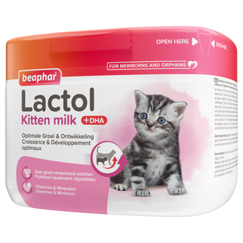 Volledige diervoeding voor moederloze kittens. Aanvullende diervoeding voor kittens, drachtige, zogende, zieke of herstellende katten. De samenstelling van Lactol Kitten Milk is verbeterd en verrijkt met DHA, dat van nature voorkomt in melk van moederpoezen. Lactol Kitten Milk is licht verteerbaar en bevat een uitgebalanceerde mix van oliën, vitaminen, mineralen en sporenelementen. De in de voeding aanwezige aminozuren, inclusief het voor katten onmisbare taurine, zorgen voor de beste start in het leven. Lactol Kitten Milk wordt aanbevolen voor: Moederloze kittens, kittens die niet voldoende drinken bij de moeder vanaf de geboorte tot aan het spenen. Ook geschikt als aanvullende voeding voor drachtige, zogende, zieke of herstellende katten.