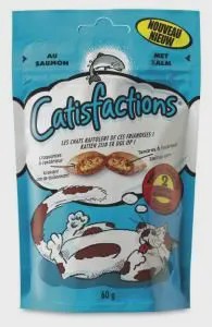 Katten halen alle trucjes uit de kast voor onweerstaanbare tussendoortjes. Met Catisfactions geef je hier met een gerust hart aan toe. Elk Catisfaction brokje bevat namelijk minder dan 2 calorieën per stuk. Zo kun je jouw kat meerdere keren per dag, met een maximum van 20 stuks, een brokje geven. Je kat zal het heerlijk vinden om eerst door een krokant laagje te bijten en vervolgens van de onweerstaanbaar zachte kern te genieten. Verkrijgbaar in verschillende smaken. Lekker voor de afwisseling of fijn voor de kieskeurige kat.