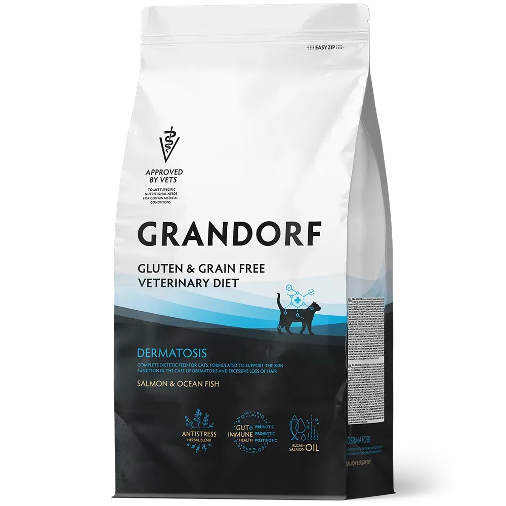 Consult a veterinarian before use. Feed Dermatosis dry food for up to 2 months during the initial course of treatment.
