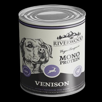 Riverwood mono-proteïne hert is een natvoer voor de hond, dat uitsluitend bestaat uit hertenvlees. Omdat dit natvoer slechts één proteïne (eiwit) bron bevat, is het bij uitstek zeer geschikt voor honden met een voedselintolerantie of voedselallergie, en kan het worden ingezet bij/als een eliminatie dieet.